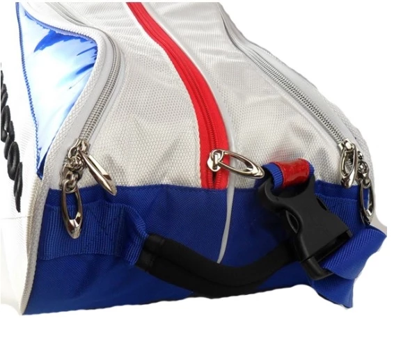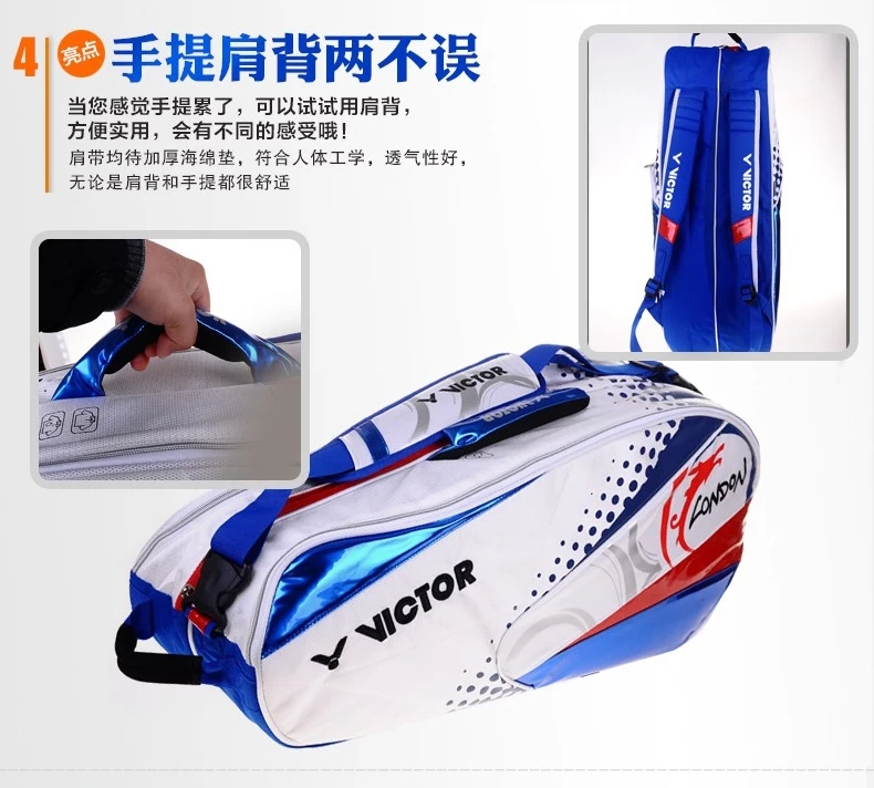 2 main compartments for your rackets and clothing, 1 front pockets with organizer compartments, and 1 shoe compartment.