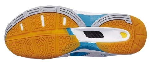 Players also care a lot about the stability and anti-slip functions of their badminton shoes. The SH-A850 has these functions. In terms of lateral stability (Fig.3), two diamond shaped extruded plates that are soft inside and hard outside form the lateral support system (LS-S); the diamond shaped extruded plates have been lengthened to provide more lateral support area and increase stability of lateral movement. In addition, a 3D carbon fiber sheet is used on the foot arch, increasing stability and support. In terms of slip-resistance, the SH-A850’s radial sole pattern has superb slip resistance for both lateral and vertical steps, providing the anti-slip capability required when suddenly stopping or thrusting.