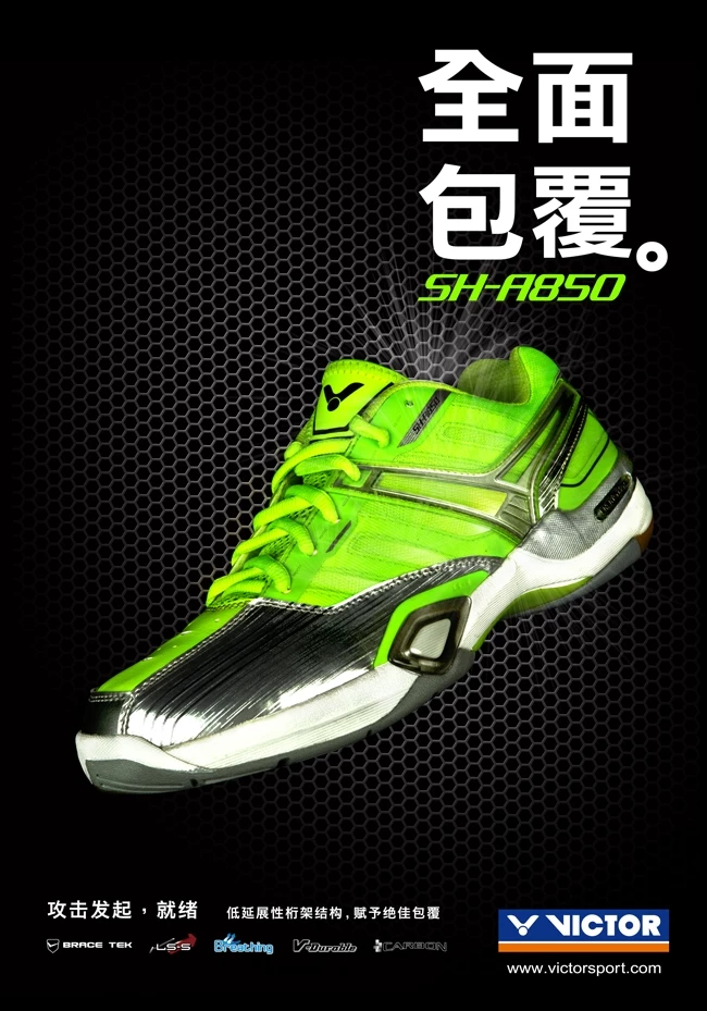 Generally speaking, badminton players care most about shoe functionality, namely foot comfort and perfect shield feeling. The most distinctive feature of the SH-A850 is thus its low ductility truss structure (Fig.1); through the use of light and thin, soft and not easily expandable material and BRACE TEK shoe body perfect shield technology, the problem of shoe upper loosening after fast running over a long period is avoided, and the perfect shield feel is maintained. In addition, to reduce the hot feeling that players feel after long periods of play, a large amount of mesh is used on the shoe body, increasing the air permeability of the shoe, thus increasing wearer comfort.