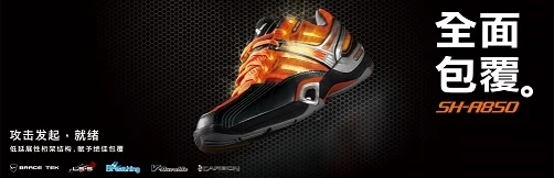 Generally speaking, badminton players care most about shoe functionality, namely foot comfort and perfect shield feeling. The most distinctive feature of the SH-A850 is thus its low ductility truss structure (Fig.1); through the use of light and thin, soft and not easily expandable material and BRACE TEK shoe body perfect shield technology, the problem of shoe upper loosening after fast running over a long period is avoided, and the perfect shield feel is maintained. In addition, to reduce the hot feeling that players feel after long periods of play, a large amount of mesh is used on the shoe body, increasing the air permeability of the shoe, thus increasing wearer comfort.